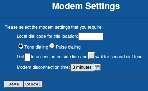 The modem window will allow users to configure their NC for the phone system it will use. On clicking the modem icon the main frame will display a HTML page similar to this: