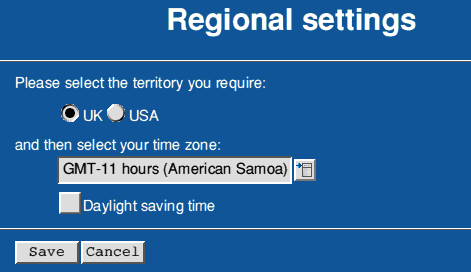 The region window will allow users to provide control over the localised aspects of the NC and set the current time zone. Selecting the territory icon will display a HTML based form similar to this:
