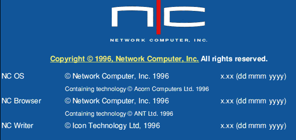 This document contains the software functional specification for the NC configuration application to be included in the system ROM of the Network Computer Model 1. The settings made in this application will be saved in the NC's NVRAM. These settings will therefore be permanent (ie. still there after the machine is turned off) and will be local to each NC (ie. not user specific).