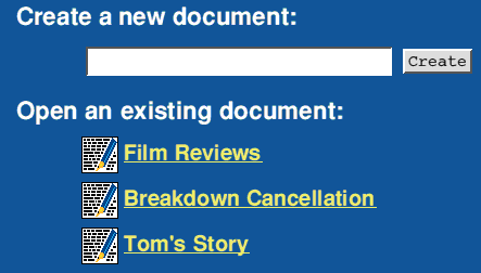 To create new documents a blank template file is required in the document directory. This file should be called "__" and will not appear in the list of the available documents. If this file does not exist then the 'Create a new document' option will not appear.